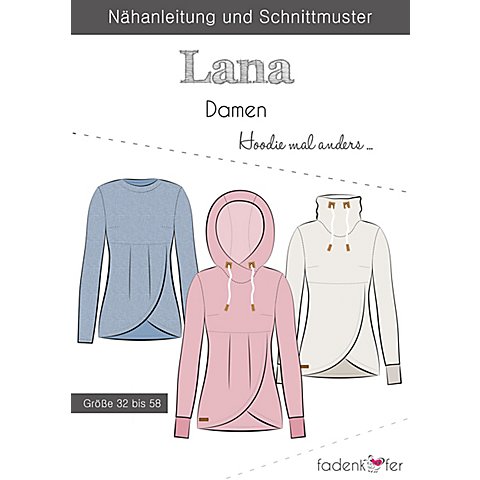 Fadenkäfer Schnitt Sweatshirt Lana für Damen, 3 Modelle, Größe 32–58, Schwierigkeitsstufe: leicht, Stoffempfehlung: Sweat, Sommersweat, Fleece, Strickstoffe.außergewöhnliches Sweatshirt in Wickeloptik3 verschiedene Kragenlösungen zur Auswahlinkl. ausführlicher Anleitung (zusätzlich mit Link zu einer noch ausführlicheren, bebilderten Anleitung im Internet)Nählevel: leichtSieht raffiniert aus, ist aber einfach genäht: Der Pullover Lana des jungen Labels Fadenkäfer ist der etwas andere Hoodie. Er besticht durch seine besondere Optik – die Faltenlegung im Vorderteil macht ihn zum Hingucker. Das Sweatshirt Lana bietet drei verschiedene Kragenlösungen an: einen normalen Rundhalsausschnitt, eine Kapuze und einen Schalkragen. So sind Sie beim Styling Ihres neuen Unikats völlig flexibel! Auch beim Stoff haben Sie die Qual der Wahl, denn neben Sweatstoffen sind auch French Terry, Fleece oder Strickstoffe geeignet.Auch Näh-Anfängerinnen dürfen sich ruhig an den Schnitt wagen, denn alle Schritte werden in der ausführlichen, bebilderten Step-by-step-Anleitung im Internet erklärt (Link im Schnittmuster enthalten). Fortgeschrittene Näherinnen können den Pulli auch anhand der kompakten Anleitung, die dem Schnittmuster beiliegt, nähen.Nähzubehör: je nach Wunsch evtl. 2 Ösen, ein kleines Stückchen Leder oder SnapPap zum Verstärken der Ösen, Kordel.