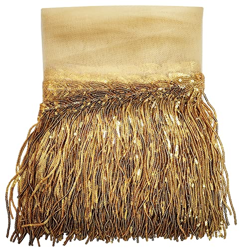 WANYIG 5 Yards Länge 20CM Breite Fransenborte Geschnitten Quaste Seide Pailletten Fransen Quastenbesatz Nähzubehör para Trimmen Apparel/Bühnenkleider/Vorhänge DIY Decoración (Dunkelgold)