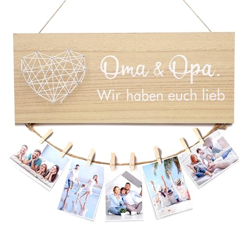 ZMDMAH Geschenk für Oma und Opa Wand Bilderrahmen Collage Wir Haben Euch Lieb Holzschild mit Fotoseil und Holz Klammern Geburtstagsgeschenk für Großeltern Foto