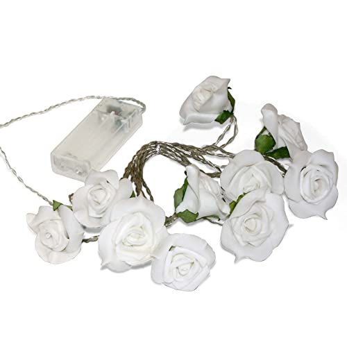 hellum LED Lichterkette mit weißen Rosen, Lichterkette innen mit 10 LED warmweiß, Batterie (2xAA, nicht inkl.) mit 2,3m Gesamtlänge, Dekoration 300239