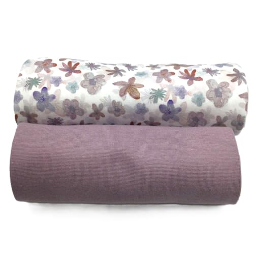 Jerseystoff Set | Jersey + Bündchen | farblich perfekt abgestimmt | je 0,5 m | Jerseystoff zum Nähen von Baby- und Kinderkleidung (Rainbow Flowers, mauve)