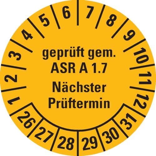 Dreifke® Prüfplakette geprüft gem. ASR A1.7, 26-31, gelb, Dokumentenfolie, Ø30mm, 18 Stück