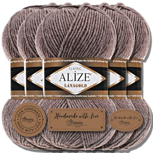 Hobby YARN 3x Etikettenlabel mit Alize Angora Gold Wolle Premium 5x100g als Set, Yarn, Garn, Dünne Mohair aus Schurwolle, Uni, Einfarbig, Strickgarn (Cocoa - 493)