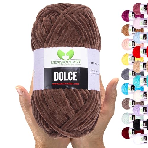 MeriWoolArt Chenille Garn zum Stricken und Häkeln Braun - 100 g und 120 m Samt-Wolle - 100% Flauschige Polyester Strickgarn für Amigurumi Kissen Decken weiche Kleidung Geschenke