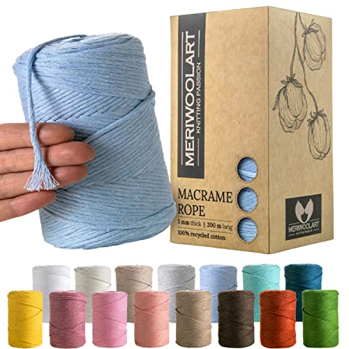 MeriWoolArt® Makramee Garn Blau - Makramee Garn 3mm farbig 200m - Super weiches Garn, einfach gedrehte Makramee Schnur - Öko-Tex 100% recyceltes Baumwollgarn farbig - DIY Boho Deko Makramee