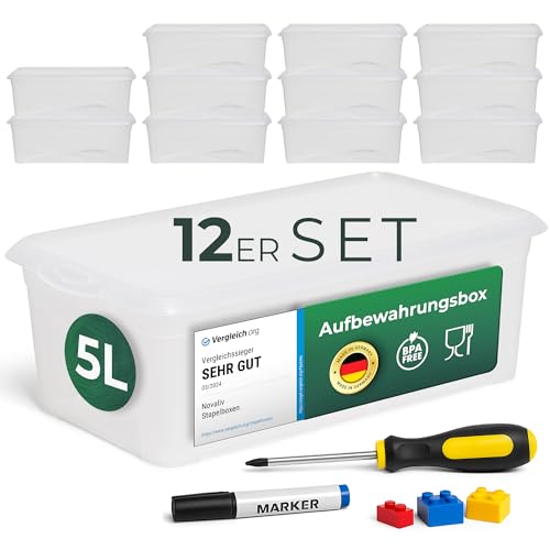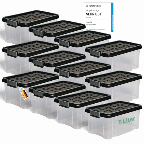 Novaliv 12x Aufbewahrungsboxen mit Deckel 5L transparente Boxen stapelbare Nestbar Storage boxes mit Clipverschluss Kunststoff BPA-frei 34x19x11 cm