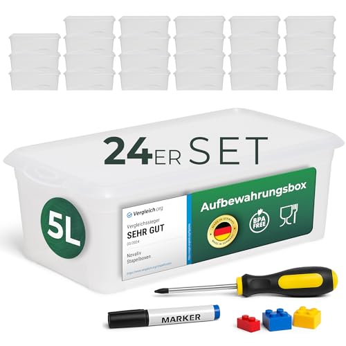 Novaliv 24x Aufbewahrungsboxen mit Deckel 5L transparente Boxen stapelbare Nestbar Storage boxes mit Clipverschluss Kunststoff BPA-frei 34x19x11 cm