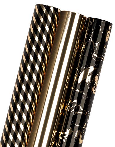 RUSPEPA Geschenkpapierpapierrolle - 3 Verschiedene Schwarzgold-Streifendesign - 43,2 cm x 3,05 m Pro Rolle