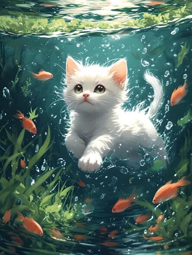 Katze Fisch Malen Nach Zahlen Kinder, Bastelset Erwachsene Frauen Paint by Numbers, Faltenfreie Leinwand, mit Pinseln und Acrylpigment-Kunstwerk Set, Zimmer Deko Kreativ Geschenk Mädchen 20x30cm W-777