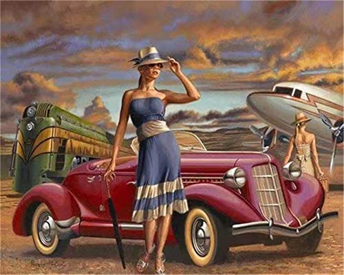 YEESAM ART Malen nach Zahlen für Erwachsene Anfänger, heldenhafte Frau, rotes Auto, 40,6 x 50,8 cm, Leinenleinwand, Acryl, Stress weniger Zahlen, Malerei, Geschenke (rot, mit Rahmen)