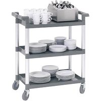 Bartscher Servierwagen TS "Adjutant" silber 83,0 x 41,5 x 94,0 cm – entspannt Gäste bedienenOb im Haushalt, Büro oder bei Events – der Bartscher Servierwagen TS "Adjutant" silber 83,0 x 41,5 x 94,0 cm macht den Transport von Speisen und Getränken einfach und komfortabel. Alles findet seinen Platz und kommt sicher ans Ziel. Diese Merkmale weist der Wagen auf: Borde, Tragfähigkeit gesamt, max. 120,0 kg, Durchmesser Rollen: 10,0 cm.Tolles Design, robuste MaterialienDieses stabile und solide Modell hat ein Gestell aus Aluminium und ist daher äußerst robust und langlebig. Die Tischplatte besteht aus Kunststoff. Mit seiner glänzenden Silberoptik wirkt der Einrichtungsgegenstand zugleich leicht, stilvoll und hochwertig.Maximal beweglichIhre Utensilien können Sie auf 3 Ebenen bequem strukturieren. Dank der 4 leichtgängigen und lenkbaren Rollen lässt sich der Bartscher Servierwagen TS "Adjutant" ohne Kraftaufwand bewegen.So belastbar ist das ModellDas Exemplar hat insgesamt ein Gewicht von 9,1 kg. Die Größe beträgt 83,0 x 41,5 x 94,0 cm (BxTxH). Ein Fachboden hält einem Gewicht von bis zu 240 kg problemlos stand.Bereit für eine Arbeitserleichterung?Beim Kauf dieses Produkts erfolgt die Zustellung zerlegt. Bestellen können Sie den Bartscher Servierwagen TS "Adjutant" silber 83,0 x 41,5 x 94,0 cm schnell und bequem hier bei uns im Online-Shop.