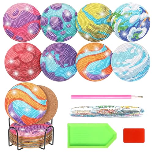 FYting 8 Stück Diamond Painting Untersetzer,Diamond Painting Erwachsene mit Untersetzer Halter,DIY Farbplanet Untersetzer für Nachmittagstee, Familientreffen und Feiertagsessen (Planet)