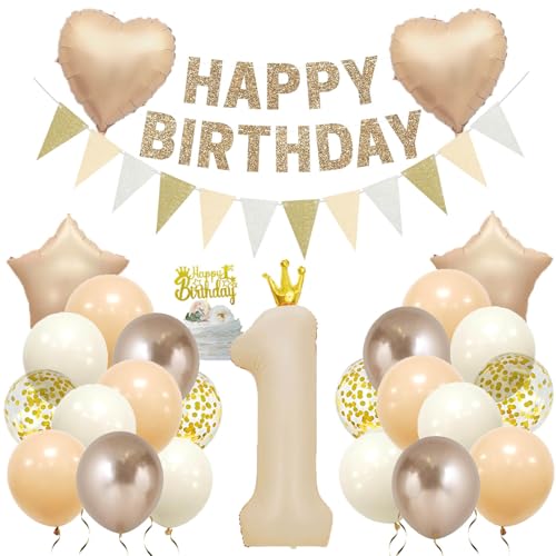 1 Jahre Geburtstagsdeko Gold Folienballon 1 Beige Zahlenballon 1. Geburtstag Deko Mädchen Junge Baby Happy Birthday Deko Kindergeburtstag