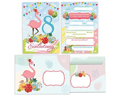 Junapack 12 Einladungskarten incl. 12 Umschläge zum 8. Kindergeburtstag achte Geburtstag Mädchen Flamingo