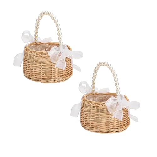2 Stück Wicker Rattan Blumenmädchen Korb Blumenkorb mit henkel und Schleife Blumenkörbe Geflochtener Korb für Die Hochzeit Blumen (Garn A)