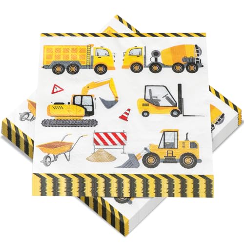 Servietten Bagger, 40 Stück Baustelle Servietten für Geburtstag, Servietten Tischdeko Baufahrzeug Bulldozer Radlader, Fahrzeuge Papierservietten für Kinder Geburtstag BAU Motto Party, 33 x 33 cm