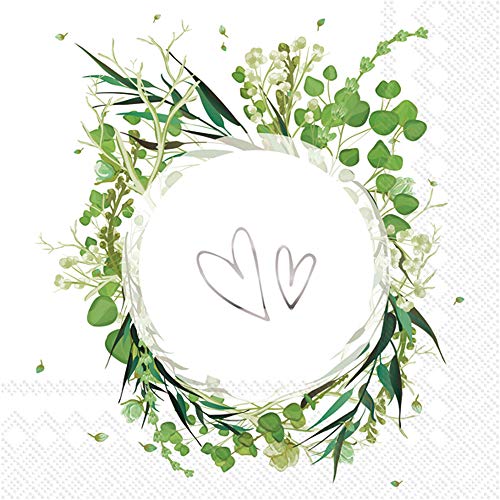 3-Ply paper napkins: package of 20 premium quality paper napkins Lunch, dinner, dessert: napkins measure 6. 5 x 6. 5" (Folded size) Festive table decor: crisp white napkins with leafy Wreath, features pair of silver hearts in the middle Soft and strong: sturdy napkins with a smooth feel; printed in Germany with non-toxic, water soluble dyes Create the look: combine with solid plates and coordinating IHR napkins from Boston International; entertain in style when celebrating birthdays, wedding receptions, enjoying summer luncheons, and for everyday dining