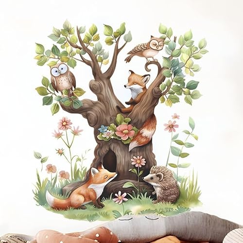 COVPAW Wandtattoo Baumhaus Wald Tier Dschungel Eule Fuchs Igel Wandaufkleber Großer Baum Wandsticker Grünland Kinderzimmer Babyzimmer Schlafzimmer Wanddeko (Tierbaum241020)