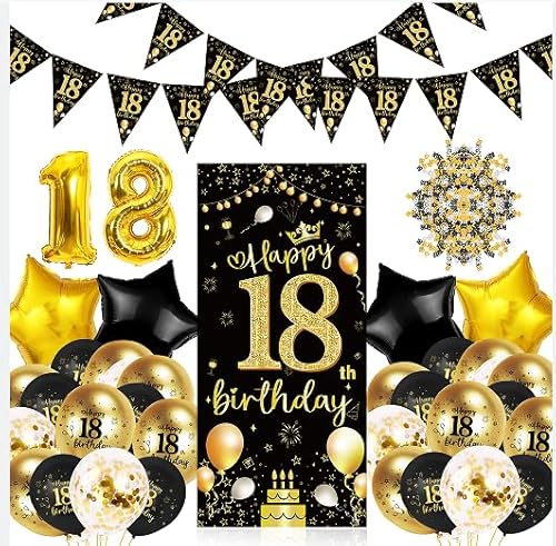 Deko 18 Geburtstag,18. Geburtstag Party Dekoration für Junge oder Mädchen,18 Happy Birthday Banner(Schwarz und Gold )