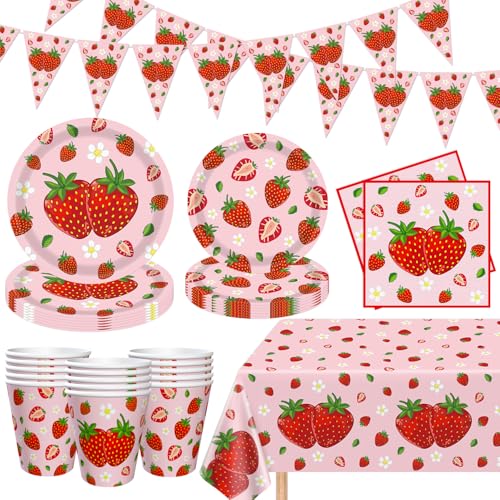 83Stück Strawberry Theme Partei Supplies Erdbeere Geburtstag Party Geschirr Set Beere Süße Geburtstag Dekorationen Obst Thema Partei Supply für 1. Baby-Dusche serviert 20 Gäste