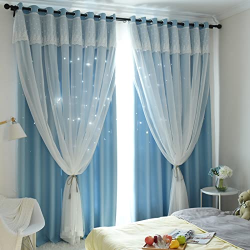 Freyamy Gardinen Mädchen Blau Schlaufenschal 2er Set Glänzend Sterne Spitze Vorhänge mit Ösen,Blickdicht Vorhang für Kinderzimmer Schlafzimmer Wohnzimmer Verdunkelungsvorhang 200 X 100 cm (HxB)