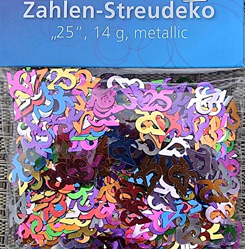 Ein Beutel Tischkonfetti Design/Ausführung: Metallic 25 / buntes Streukonfetti in Form der Zahl 25 Farbe: bunt Material: Kunststoff Maße: ca. 14 g (Beutel), ca. 10 x 10 mm (einzelne Streu-Elemente), Hersteller: HEKU