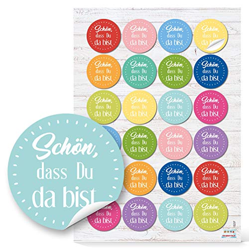 FÜR GÄSTE & EVENTS: Die Aufkleber mit der Aufschrift „Schön, dass du da bist“ sind ideal für Hochzeiten, Taufen, Geburtstage, Seminare, Einweihungen oder jede Veranstaltung mit lieben Menschen HERZLICHE BEGRÜSSUNG: Die runden Sticker heißen Gäste willkommen und schaffen sofort eine warme Atmosphäre – perfekt für Gastgeschenke, Kindertüten, Hochzeitstüten oder Geburtstagstüten BUNTES DESIGN: Die Etiketten erscheinen in 12 fröhlichen Farben und sorgen auf Papiertüten, Geschenkverpackungen oder Karten für eine liebevolle, farbenfrohe Note VIELSEITIG EINSETZBAR: Ob als Aufkleber für Geschenktüten, Tischkarten, Willkommensgeschenke oder zur Gestaltung der Tischdeko – die Sticker setzen persönliche Akzente bei jeder Feier HOCHWERTIGE QUALITÄT: Die selbstklebenden Papieraufkleber (Ø 4 cm) haften gut auf glatten Oberflächen. Ein leichtes Nachdrücken nach ein paar Minuten sorgt für optimalen Halt