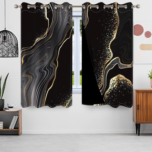 Uiiooazy Gardinen Schwarz Gold, Vorhänge Marmor Optik Abstrakt Marmoriert Thermovorhang Blickdicht Polyester Vorhang Verdunkelungsvorhänge mit Ösen für Schlafzimmer Wohnzimmer Kinderzimmer, 140x175cm