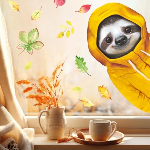 Wandtattoo Loft Fensterbild reinschauendes Faultier mit gelbem Schal Regenjacke bunte Blätter Herbst herbstlicher Fensteraufkleber Fensterdeko Herbstdeko, 1. A4 Bogen, Von Rechts