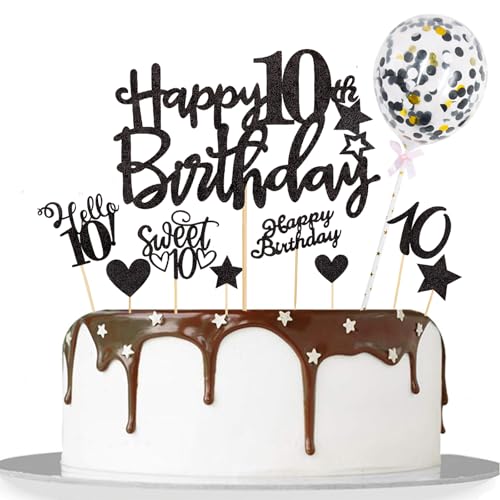 Catelves Tortendeko 10 Geburtstag Junge Mädchen,10 Stk Glitzer Kuchendeko Geburtstag 10 Jahre Mädchen,Happy 10th Birthday Cake Topper Schwarz,Sweet 10 Torten Deko Geburtstagsdeko 10 Jahre Junge