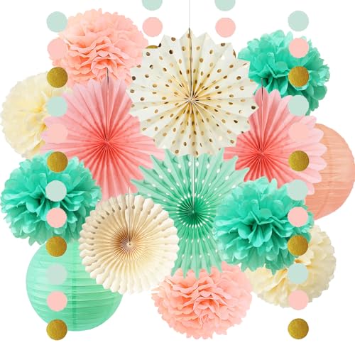 Party Deko Salbeigrün Rosa Seidenpapier Pompoms Deko Grün Rosa Papierfächer Papierlaterne Salbeigrün Papier Girlande für Geburtstagsdeko Babyparty Brautparty Hochzeit Party Deko
