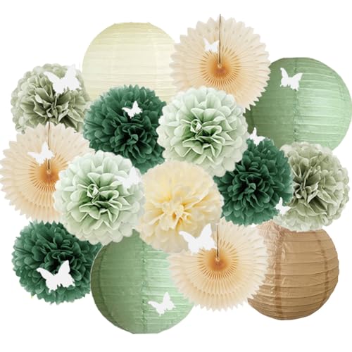 Party Deko Salbeigrün Papierlaternen Pompons Deko Salbei Beige Party Deko Olivgrün mit 3D Schmetterling Weiß für Babyparty Deko Beige Grün Brautparty Geburtstag Hochzeit Verlobung Gartenparty Deko