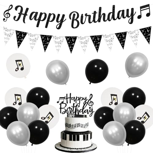 Jollyboom Geburtstagsparty-Dekorationen mit Musikthema – Happy Birthday Banner, Notizen Wimpelkette, schwarz-weiße Luftballons, Kuchenaufsatz für Kinder und Erwachsene, Partyzubehör