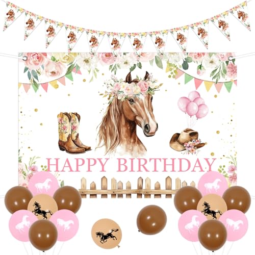 Jollyboom Pferde Deko Geburtstag Mädchen, Pferde Hintergrund Happy Birthday Banner Rosa Floral Wimpelkette Luftballons für Kindergeburtsta Pferderennen Geburtstag Party