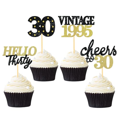 24 Stück Glitzer 30. Geburtstag Cupcake Topper Geburtstagsdeko von 1995 für 30 Geburtstagsfeier Zubehör Party Dekoration Kuchendekoration (Schwarz & Gold)