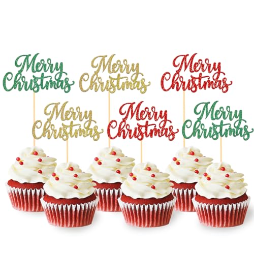 24 Stück Glitzer Weihnachten Cupcake Toppers, Merry Christmas Tortendeko, Frohe Weihnachten Kuchen Deko für Neujahr Party, Weihnachtsfeier Deko (3 Christmas)