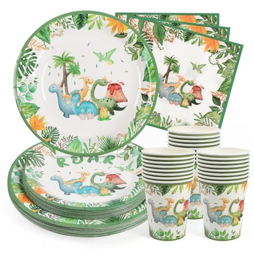 PARTY GO Partygeschirr 96 Stück Dinosaurier Geburtstag Partyteller Partyzubehör Set enthält Pappteller Servietten Besteck für Geburtstagsparty Dekorationen Baby-Dusche-24 Gäste