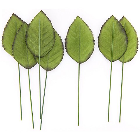Rosenblätter aus Kunststoff, Farbe: grün, Blattgröße: 5 x 3 cm, Länge: 11 cm, Inhalt: 20 Stück.Ob für festliche Dekorationen oder romantische Bastelideen - diese künstlichen Rosenblätter sind, zusammen mit anderen Kunstblumen, ideal zum Einarbeiten in Gestecke, Kränze oder Sträuße. Aber auch als Streudeko für eine festliche Tafel sind sie sehr dekorativ.