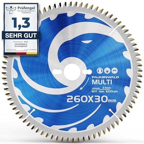 FALKENWALD® Sägeblatt 260x30 mm (Multi) - Kreissägeblatt mit 80 Zähnen aus Hartmetall für Holz, Metall, Aluminium und Kunststoffe - Sägeblatt 260 x 30 mm kompatibel mit Makita HS0600, Bosch usw.