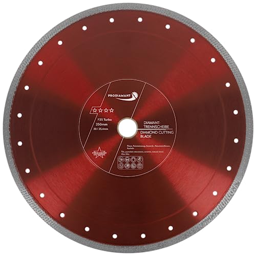 EIGENSCHAFTEN: Die Diamant Trennscheibe F35 Turbo mit dem Durchmesser ø 350mm mit verstärktem Flansch (verstärkte Aufnahme) Bohrung 30mm und Reduzierung auf 25,4 mm, passt auf alle gängigen Maschinen mit 30/25,4mm Aufnahme. DIAMANTSEGMENT: Unser langlebiges Segment ist extrem dünn, 10mm hoch und mit hochwertigen Industriediamanten gefertigt. Optimales Schnittbild, saubere Kanten ohne Ausrisse. Durch die dünne Bauweise wird ein sehr schnelles schneiden ermöglicht. ANWENDUNGSBEREICH: Fliesen, Feinsteinzeug, Naturstein, Marmor, Granit, Keramik, Badfliesen, Bodenfliesen, Wandfliesen, Steingut, Steinverbund, Fugen, Fugenputzen, Fugenreinigen. MARKENQUALITÄT: Die deutsche Marke PRODIAMANT steht seit über 10 Jahren für Qualität, Zuverlässigkeit und Kundenservice. An uns können Sie die höchsten Ansprüche stellen, gerne beraten wir Sie zu Produkt und Anwendung. Preis-Leistung ist unser Maßstab, unsere Qualität ist auch unsere Garantie. Für dieses Versprechen stehen wir ein. SICHERHEIT: Premium-Werkzeug mit hervorragendem Preis-Leistungsverhältnis, geprüft nach EN13236, hohe Standzeit durch qualitativ hochwertige und temperaturbeständige Diamanten. Die langjährige Erfahrung unserer Mitarbeiter erlaubt es uns hervorragend abgestimmtes Werkzeug für verschiedene Anwendungsbereiche anzubieten. PERSÖNLICHE SCHUTZAUSRÜSTUNG: Verwenden Sie beim Arbeiten mit Diamantwerkzeugen immer die passende Schutzausrüstung. Tragen Sie Schutzbrille, Sicherheitsschuhe, Handschuhe, Atemmaske mit Staubfilter, Gehörschutz lesen und beachten Sie die Sicherheitshinweise.