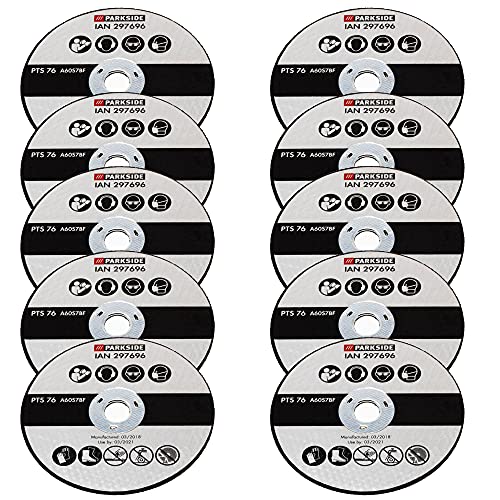 10er Parkside Trennscheiben-Set für den Parkside Akku Winkelschleifer PWSA 12 B1 mit der LIDL IAN 334002 Scheibengeschwindigkeit: max. 80 m / s zum Trennen- oder Schleifen von Werkstücken geeignet für Materialien wie Metall, Stein, Holz, Kunststoff, Fliesen und Nicht-Metalle (NE-Metalle) optionale Schleifwerkzeuge entnehmen Sie der Bedienungsanleitung