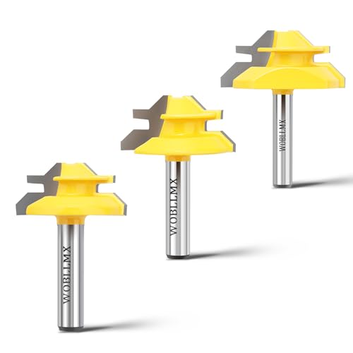 3 Stück 45 Grad Verleimfräser Gehrung Fräse:Schaft:8mm,Schnitthöhe:12.7mm/15.8mm/19mm,Durchmesser:35mm/38mm/51mm. Hergestellt aus YG6-Hartmetalllegierungsstahl,mit hoher Härte,und die wärmebehandelte Klinge ist scharf und glatt.Die beschichtete Oberfläche ist rostfest und hat eine lange Lebensdauer. 45-Grad-Schloss-Gehrungs-Router-Bit könnte für Schranktüren,Fenster,Holzschublade,Fenster,Schrank und andere Holzbearbeitungsprojekte verwendet werden.Verbinden Sie Bretter im 90°-Winkel mit einem Verriegelungsprofil für eine perfekte Ausrichtung der Fugen. Schneiden einer Vielzahl von Verbundmaterialien Wie Massivholz,Hartholz,Nadelholz,MDF,Spanplatte,Sperrholz Massivholz.Verwendet zum Nuten,Erzeugen von Bogen, Trimmen. Er eignet sich für alle Handrouter und Tischrouter der Serie. Verriegelung Gehrungsbohrer kann einen ziemlich großen Biss aus dem Holz nehmen,so dass die Verwendung dieser Bits in einem Frästisch dringend empfohlen wird.