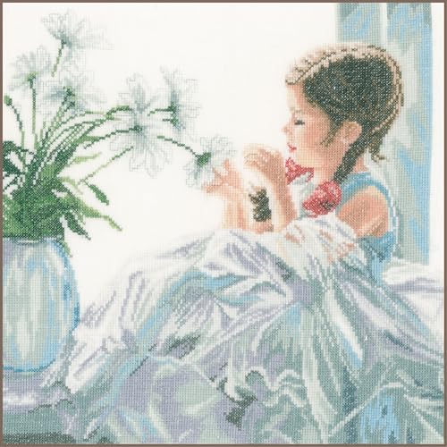 Lanarte Kreuzstich Stickpackungen Gezählter Kreuzstichbilder Set MÄDCHEN MIT BLUME Wanddekoration Handarbeit Set für Erwachsene 30 x 30 cm DIY Deko Bastelset Handwerker Kreative Geschenkset