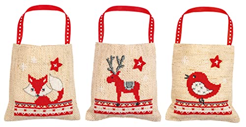 Vervaco Zählmusterpackung Stickset Säckchen Weihnachten Tiere 3er DIY Gezählter Kreuzstich Stickpackungen Basteln Erwachsene Kreativ Set 9 x 9 cm Stickset für Anfänger Stoffbeutel zum Sticken