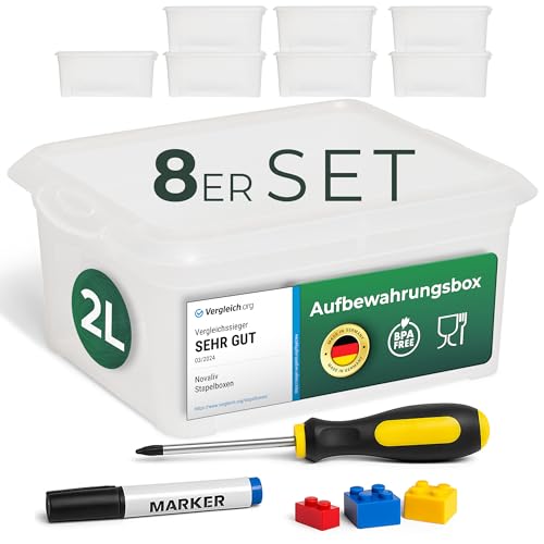 VIELSEITIG: Die Aufbewahrungsbox klein eignet sich für kleine Gegenstände wie Kosmetikartikel, Schreibwaren, Puzzles, Schrauben, Nähzubehör oder Perlen. Daher ideal als Organizer Box, Spielzeugkiste. ROBUST: Aufbewahrungsboxen für Bad sind aus speziellem hochtransparenter Kunststoff. Enthält das gleiche Material wie bei Lebensmittelechten Boxen. BPA und phthalatfrei (keine Weichermacher enthalten) STAPELBAR & NESTBAR: Die Ordnungskisten mit Deckel sind Stapelbar und können ineinander gestellt werden. Die Klarsichtboxen sind ein Baukastensystem und mit anderen Boxen von Novaliv kombinibar. VERSCHLIESSBAR: Die Plastikbox mit Deckel ist nahe zu Luftdicht verschlossen um Gerüche zu vermeinden. Tragkraft beträgt ca. 1 KG. Maße der Box (LxBxH) Außen: ca. 20x16,5x9 cm, Innen: ca. 17x14x8 cm Lieferumfang: Sie erhalten 8x Aufbewahrungsboxen mit Deckel klein, Volumen 2 Liter, hergestellt in Deutschland, 100 % Neumaterial Polypropylen, der Marke Novaliv.