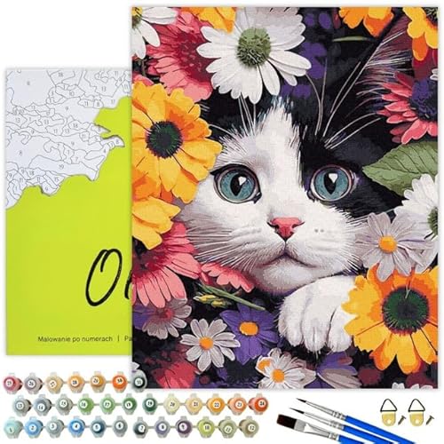 Oh Art! Malen Nach Zahlen Erwachsene Paint By Numbers Adult Set Mit 3 Pinseln Acrylfarben Und Leinwand Gespannt Auf Holzrahmen Kreativ Set DIY Bastelset 40 x 50 cm Mit Rahmen Cat in flowers