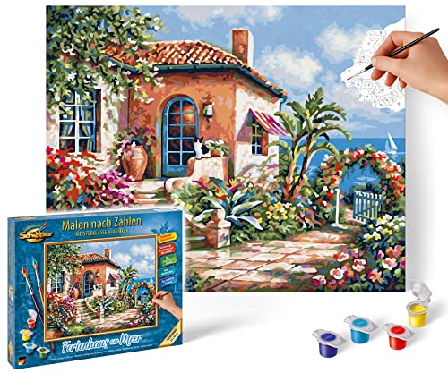 Schipper 609240795 Malen nach Zahlen - Ferienhaus am Meer - Bilder malen für Erwachsene, inklusive Pinsel und Acrylfarben, 24 x 30 cm