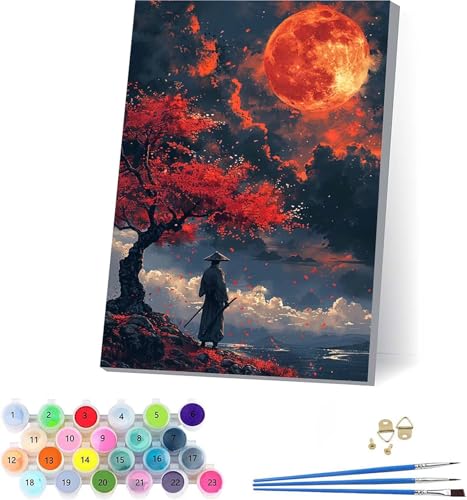 Sonne Malen Nach Zahlen Erwachsene Mit Rahmen, Malen Nach Zahlen Samurai, DIY Set Erwachsene Mit 3 Pinseln und Acrylfarbe, Paint by Numbers für Deko Wohnzimmer, Geschenke für Frauen 100x135cm 7-1322