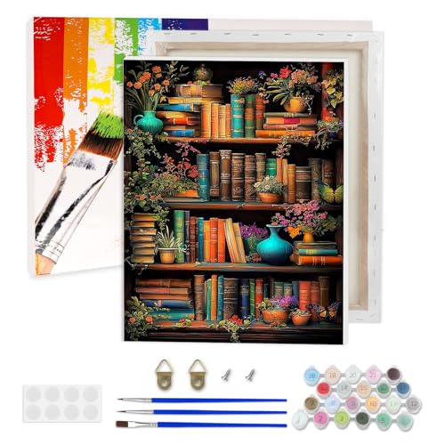 AIRDEA Bücher Malen nach Zahlen Erwachsene, Bücherregal DIY Handgemalt Ölgemälde Kit, Paint by Numbers mit 3-Pinseln und Acrylfarbe 30x40 cm (Gerahmt)