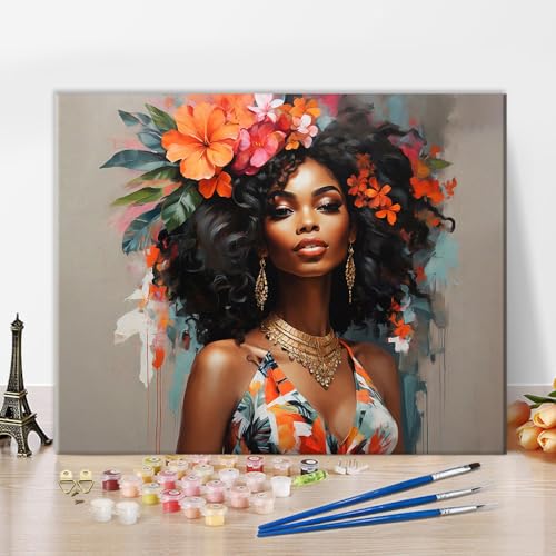TISHIRON Malen nach Zahlen Erwachsene Schwarze Frauen und Blumen, Malen nach Zahlen für Erwachsene Afrikanisch, Malen nach Zahlen Kits Schwarzes Mädchen, Kunsthandwerk 40 x 50 cm(rahmenlos)